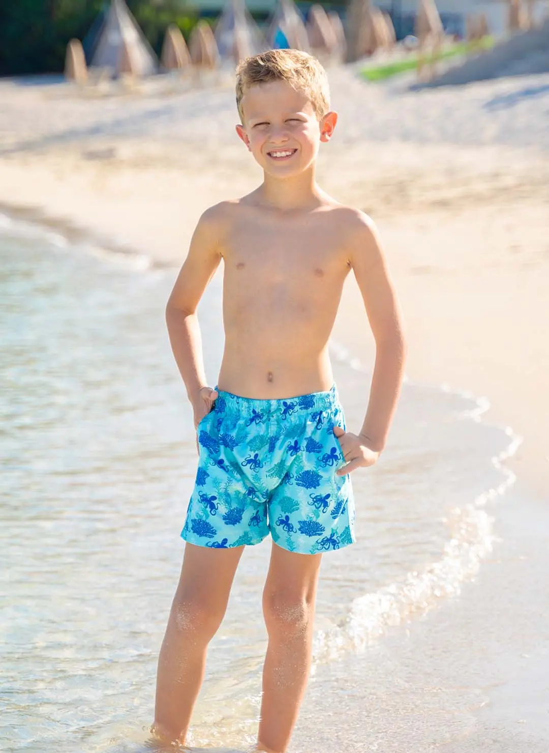 These vibrant blue swim shorts showcase an octopus design and coral print, capturing the essence of the ocean. Designed for style and comfort, their quick-dry fabric and eye-catching patterns make them a standout choice for any beach day.